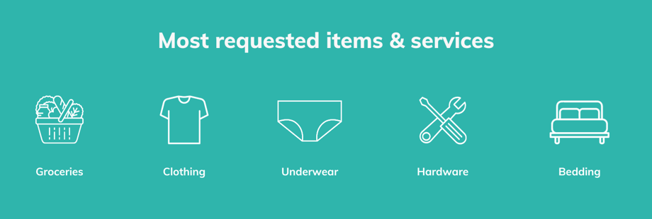 - Food, fuel, clothing, appliances and furniture for an immune-compromised woman and her hearing-impaired family member who were living in a caravan during their recovery.
