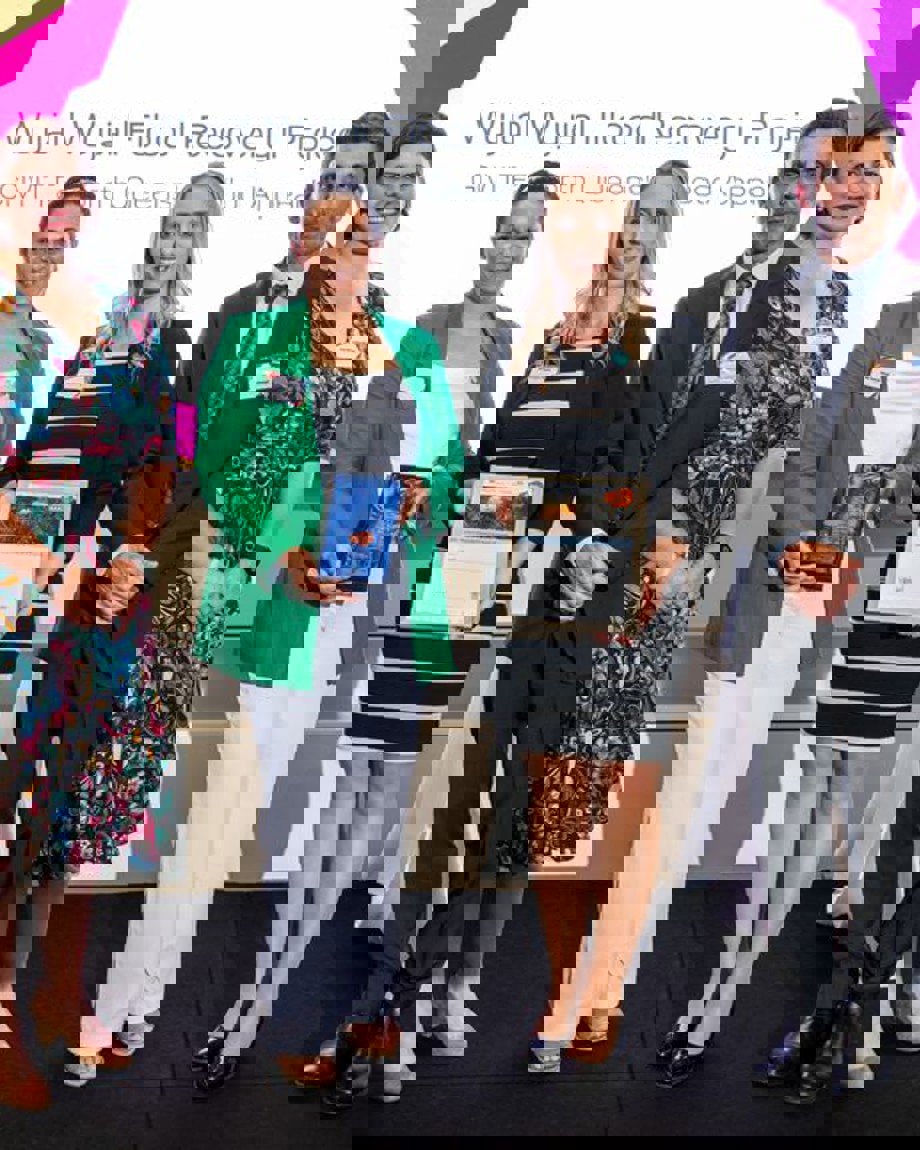 GIVIT staff Temiah (second from left) and Christina (second from right) attended the event and accepted the award from QLD Minister for Fire and Disaster Recovery, The Honourable Nikki Boyd (left), and Queensland Reconstruction Authority CEO, Major General Jake Ellwood (right).