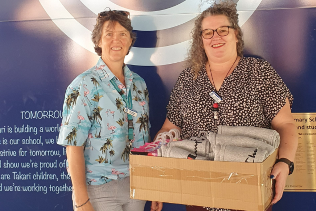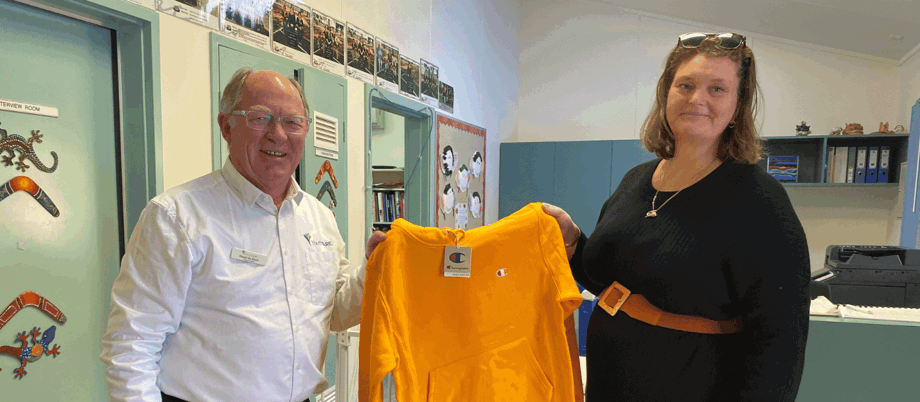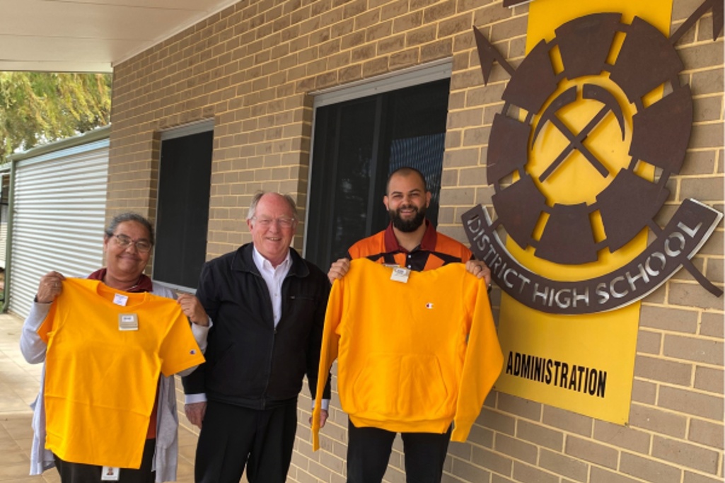 YouthCare Chaplain and a staff member from a school in Western Australia with jumpers donated by Hanes.